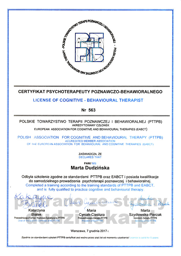 - Uzyskanie certyfikatu psychoterapeuty poznawczo-behawioralnego, certyfikat nr 563